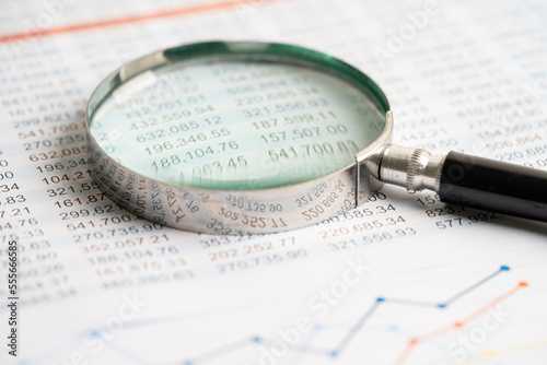 Magnifying glass on charts graphs paper. Financial development, Banking Account, Statistics, Investment Analytic research data economy, Stock exchange trading, Business office concept.