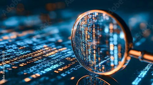 Magnifying Glass Over Data Matrix Illuminates Digital Information and Technology Concepts with Blue and Orange Highlights