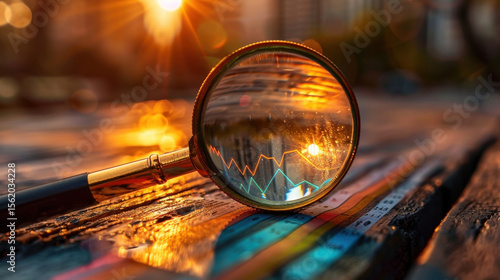 Magnifying glass rests on colorful bar chart, symbolizing business analysis and growth. warm sunset light enhances scene emotional depth