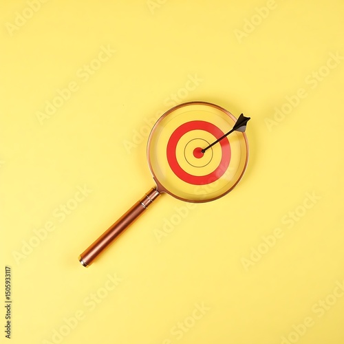 Magnifying glass revealing bullseye target hit accurately by an arrow on yellow background