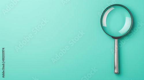 Magnifying glass with metallic handle on mint green background, symbolizing search, research, and discovery. Simple and minimalistic design.