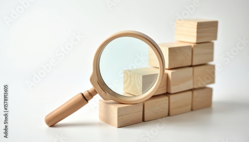 Magnifying glass wooden blocks on white background. Concept analysis strategy. Inspection detail, observation, assessment. Geometric shape measurement, business plan, construction. Creative minimal