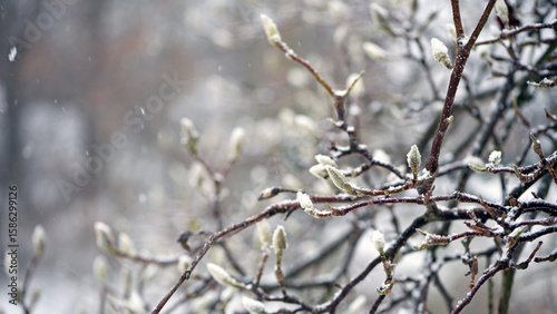 magnolia buds in ice. magnolia branch in early spring, close-up. Magnolia buds after the first snow. isolated on natural blurred background, cold time. macro photo, beauty of nature. frozen magnolia