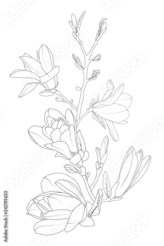 Magnolia flowers bloom blossom tree branch. Line art isolated black white drawing. Botanical vector design element.