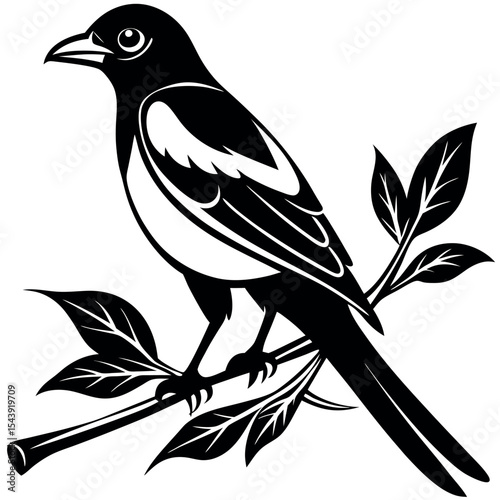 Magpie bird on branch silhouette isolated on white background