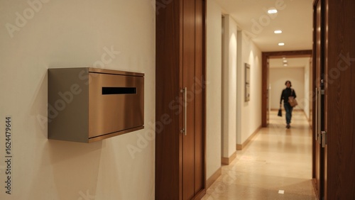 Mail being inserted into a mailbox located in the entryway of a residential complex.