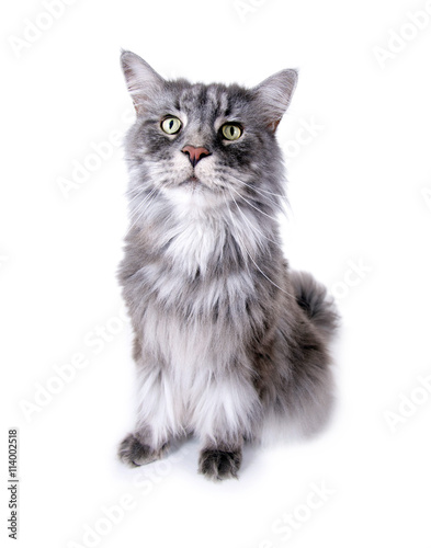 Main Coon Katze, sitzend vor weißem Hintergrund