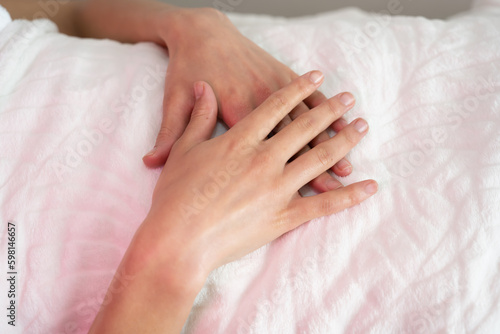 mains d'une femme posées sur son ventre pendant un soin esthétique