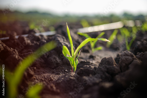 maize corn seedling in the agricultural plantation in the evening, Young green cereal plant growing in the cornfield, animal feed agricultural industry