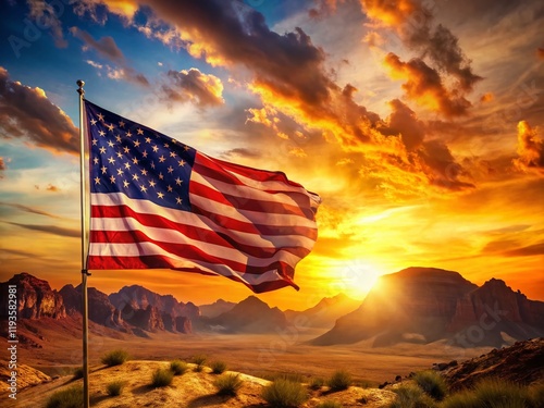 Majestic American Flag Sunset: Double Exposure Desert Landscape Stock Photo
