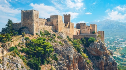 Majestic ancient castle perched on a rocky hill, surrounded by lush greenery and a stunning blue sky. Perfect for history lovers.