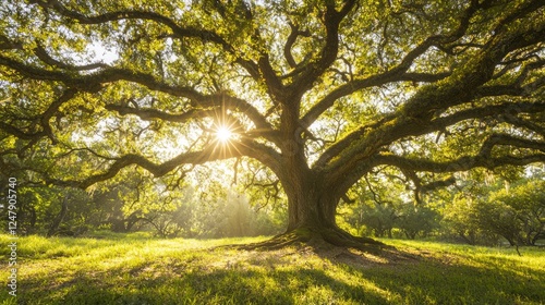Majestic Ancient Oak Tree Shining Under Golden Sunlight