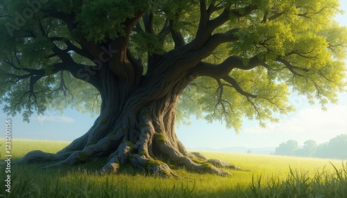 Majestic Ancient Tree in Spring Meadow Sunlight Lush Green Foliage Serene Nature Scene