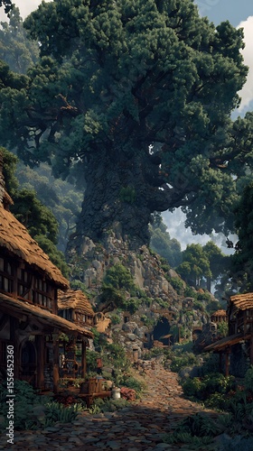 Majestic Ancient Tree Towering Over Rustic Village Pathway in Forest Setting