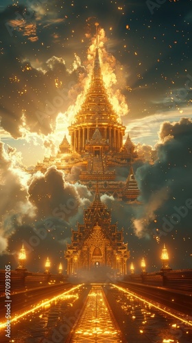 Majestic and intricate golden celestial temple shimmering in the radiant hues of a mystical sunset sky evoking a sense of spiritual wonder and divine enchantment