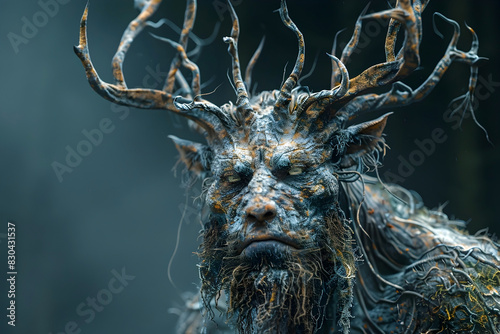 Majestic Anthropomorphic Creature with Striking Antlers and Rugged Skin in a Dramatic Magical Woodland Setting