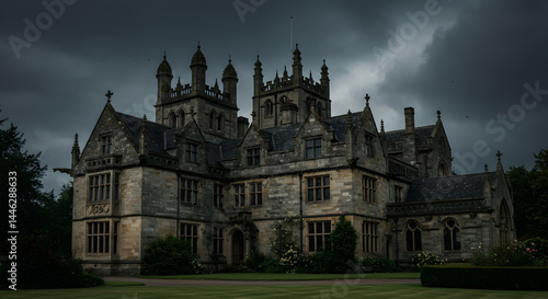 Majestic Architectural Stone Estate Under Dramatic Sky in Rural Setting