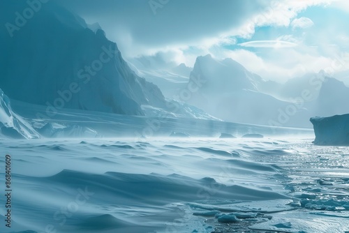 majestic arctic landscape towering glaciers loom over frozen sea blizzard swirls snow through air ethereal blue light bathes icy wilderness in otherworldly glow