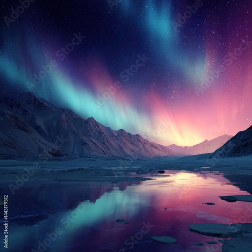 Majestic aurora borealis illuminates snowy mountains reflected in serene glacial lake under starry night sky creating ethereal winter landscape