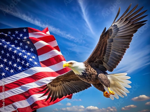 Majestic Bald Eagle Soaring Above American Flag, 4th of July Celebration