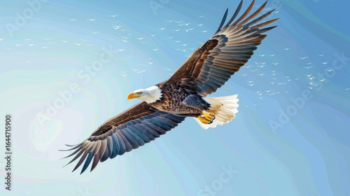 Majestic bald eagle soaring through a clear blue sky with wings spread wide
