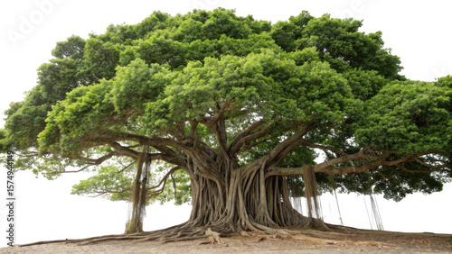 Majestic banyan tree with aerial roots and lush green canopy isolated on transparent background
