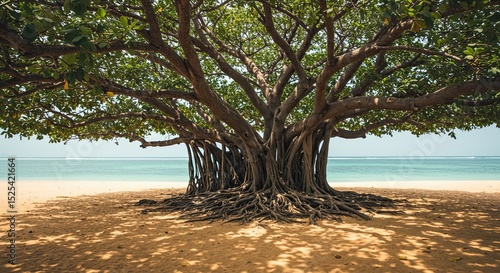 Majestic banyan tree with sprawling roots on a sandy beach overlooking the ocean