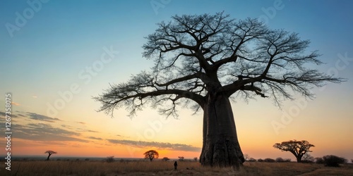 Majestic Baobab Tree Silhouetted Against a Vibrant Sunset Sky in African Landscape