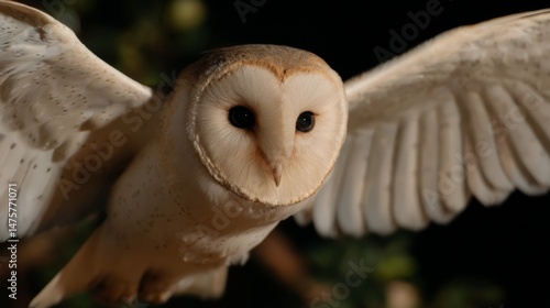 Majestic Barn Owl in Flight with Outstretched Wings Against Dark Background for Nature Photography