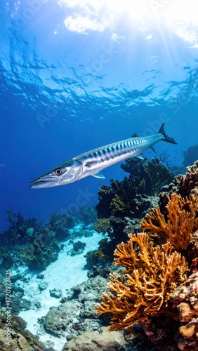 Majestic Barracuda Swimming Among Vibrant Coral Reefs Underwater