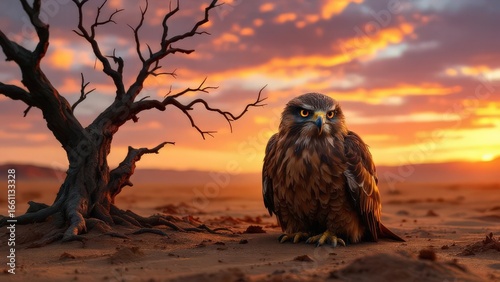 Majestic bird of prey rests near a barren tree at sunset