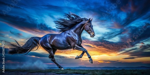 Majestic Black Horse Braided Mane, Dynamic Pose, Blue Sky Background - Stock Photo