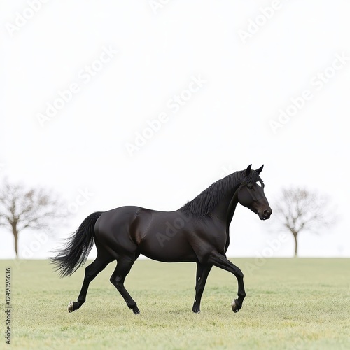 Majestic Black Horse Galloping Across Green Meadow with Trees
