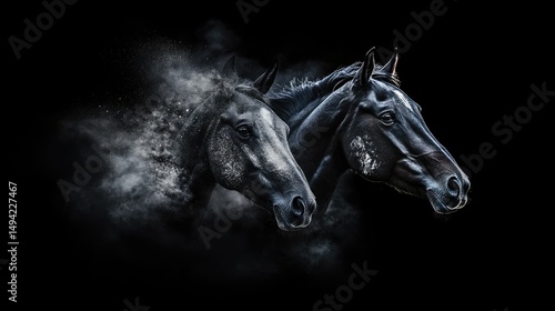 Majestic Black Horses Surrounded by Ethereal Dust Clouds in a Captivating Dark Background