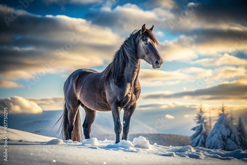 Majestic Black Stallion in Winter Wonderland: Snow Covered Landscape Stock Photo