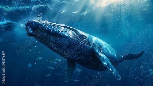 Majestic Blue Whale Gracefully Navigating the Vast Sunlit Ocean with a School of Fish