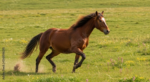 Majestic brown horse galloping across a vibrant green meadow under a clear blue sky