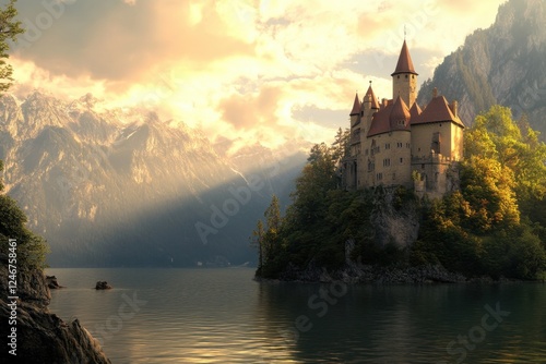 Majestic castle on a serene lake surrounded by mountains during golden hour