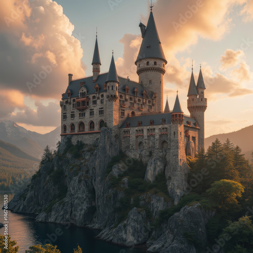 Majestic castle on rocky cliff, surrounded by serene water and lush trees, under dramatic sky at sunset, evoking sense of wonder and adventure