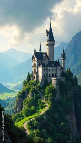 Majestic Castle on Verdant Hilltop Panoramic Valley and Mountain View Under Dramatic Sky