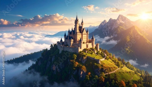 Majestic Castle Overlooking a Sea of Clouds, Fantasy Landscape, Dramatic Lighting