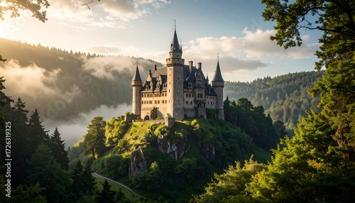 Majestic castle perched atop a hill, bathed in golden sunset light, nestled amongst lush green forests and fog-filled valleys