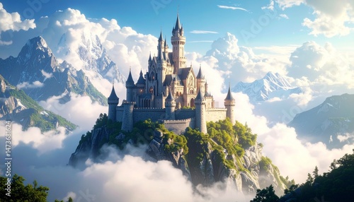 Majestic castle perched atop a verdant peak amidst cloudscapes and mountain range