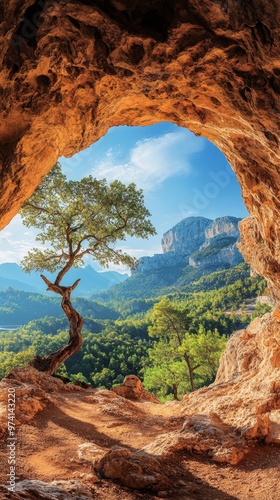 Majestic Cave with Ancient Rock Arch Overlooking Wilderness