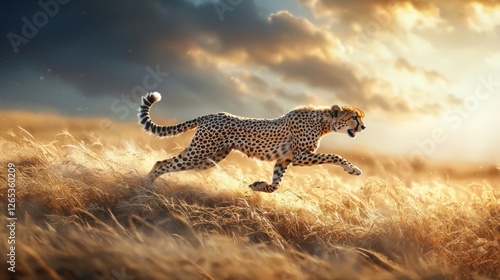 Majestic cheetah sprinting across golden grassland under a dramatic sky with warm sunlight illuminating the scene