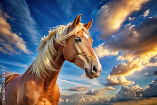 Majestic Chestnut Horse with Golden Mane Against a Dramatic Sunset Sky