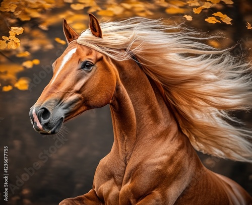 Majestic Chestnut Stallion with Flowing Mane in Autumn