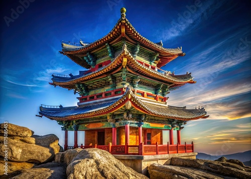 Majestic Chinese Rock Pagoda Against a Vivid Blue Sky - High Resolution Stock Photo