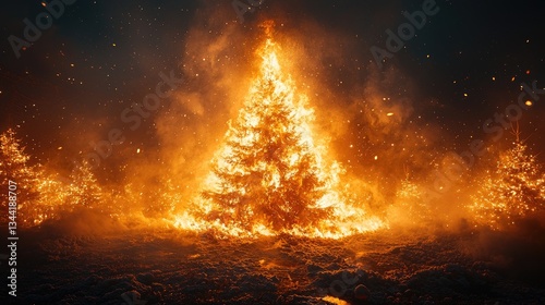 Majestic Christmas tree engulfed in flames amidst snowy landscape at night