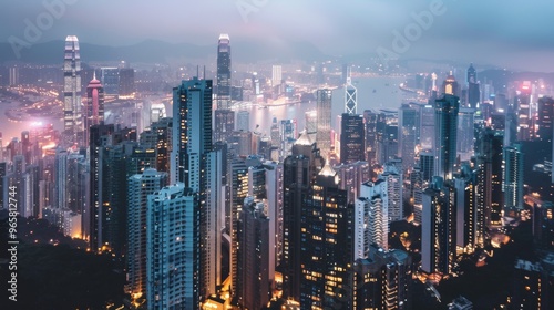 Majestic city skyline featuring towering skyscrapers and illuminated buildings at dusk, with a soft glow from the city lights.